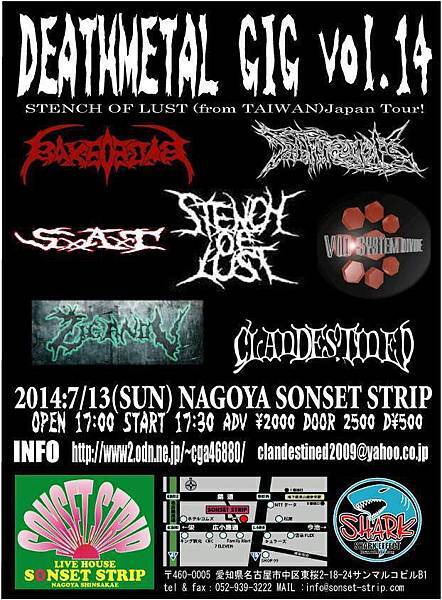 7月13日名古屋演唱會除了有我們老大的台灣與加拿大混血猛獸S.O.L(TW)外,也邀請日本當地極端樂團BLIND HATE、BAKED BOMB、ZIGANOV、SxAxT、VIO SYSTEM DIVIDE、CLANDESTINED一起共襄盛舉,將與日本歌迷們挑戰最猛烈的極端音樂!