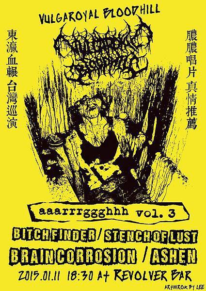 啊啊啊第三屆(ARGH vol.3):GOREGRIND CRUSHER TOUR ASIA 2015這次更邀請了日本超強動感血輾Vulgaroyal Bloodhill將與台灣列強們廝殺一番~