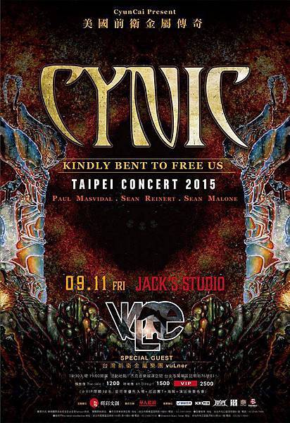 CYNIC其曲風融合Jazz、Progressive與Death Metal 等元素,將各個樂器的演奏技巧發揮到淋漓盡致,複雜卻又處處細膩的樂句與充滿深度寓意的歌詞,讓人深陷遼闊的思想空間裡.現在CYNIC首度來台並以其黃金陣容演出,廣大的粉絲朋友們將有機會一睹其傳奇樂團的風采!